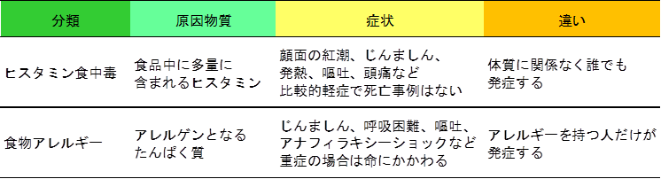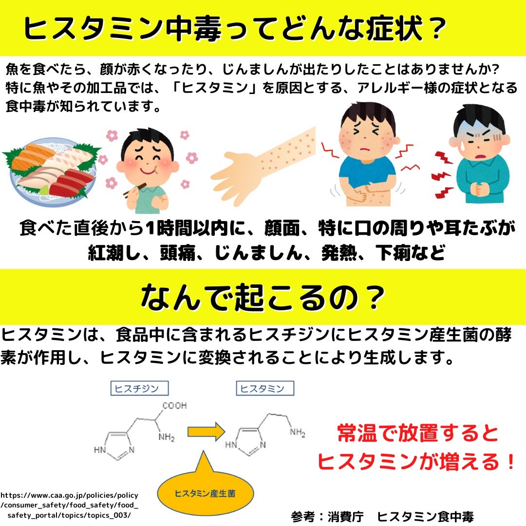 | アレルギーではない蕁麻疹「ヒスタミン中毒」 …してヒスタミンは熱に安定なので、調理してもそのまま残ります。国内のヒスタミン食中毒事例の調理方法では、焼き物や揚げ物の事例が多く、特に事前に調味液に漬… (出典:薬師寺泰匡) |